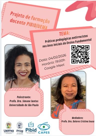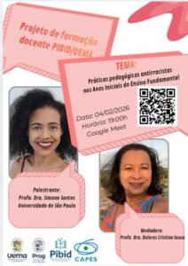 A palestra, promovida pelo Subprojeto de Pedagogia – CECEN, será realizada por meio do Google Meet e tem como objetivo promover reflexões sobre como o racismo se manifesta no contexto escolar, bem como discutir estratégias para o seu enfrentamento. Durante o encontro, serão apresentadas práticas pedagógicas antirracistas voltadas aos Anos Iniciais, com ênfase no cumprimento das Leis nº 10.639/03 e nº 11.640/08, abordando a afrobetização (alfabetização histórica ou étnico-racial), além do uso de livros, jogos, brincadeiras e outros recursos pedagógicos.